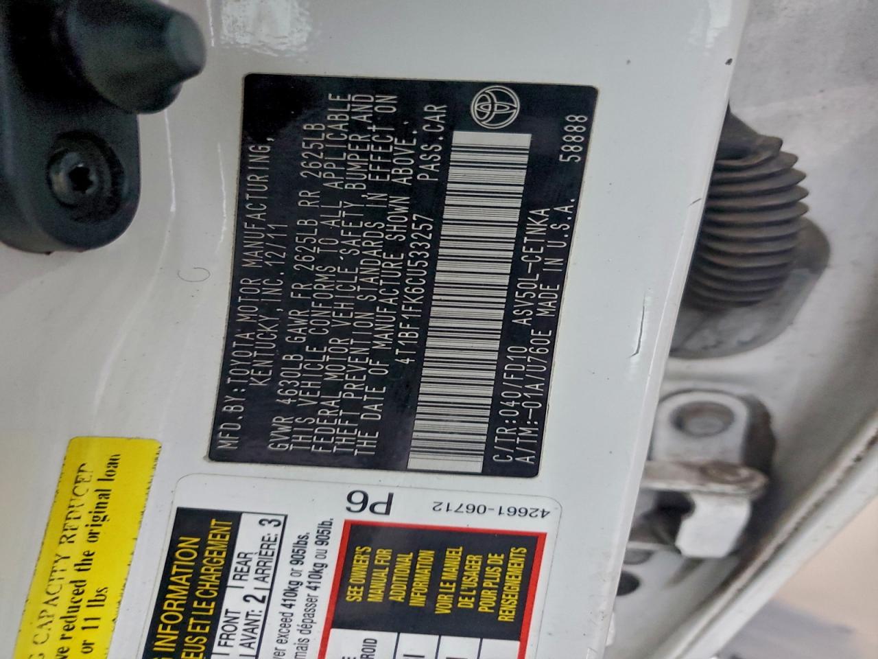 Колір БілийЦиліндри 4VIN 4T1BF1FK6CU533257Стан Заводиться та їде (перевірено)Ушкодження Передня або задня