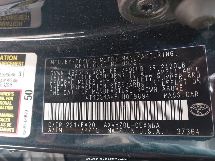 2020 TOYOTA CAMRY HYBRID - 4T1C31AK5LU019694, колір - Синій, 2.5, Гібрид, Передній привід із США