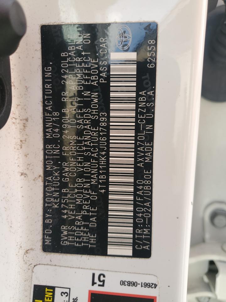 2018 TOYOTA CAMRY - 4T1B11HK4JU617893, колір - Білий, 2.5, Бензин, із США