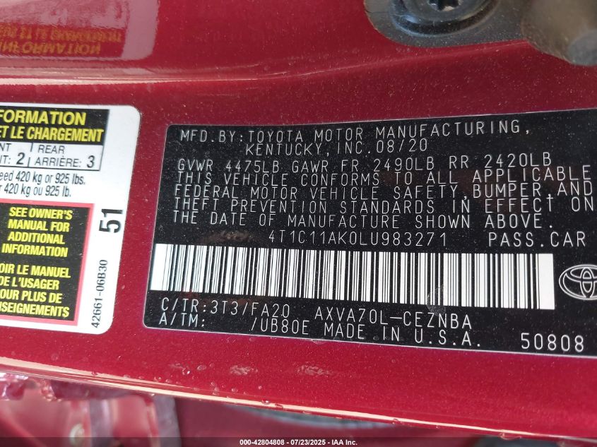 2020 TOYOTA CAMRY - 4T1C11AK0LU983271, колір - Червоний, 2.5, Бензин, Передній привід із США