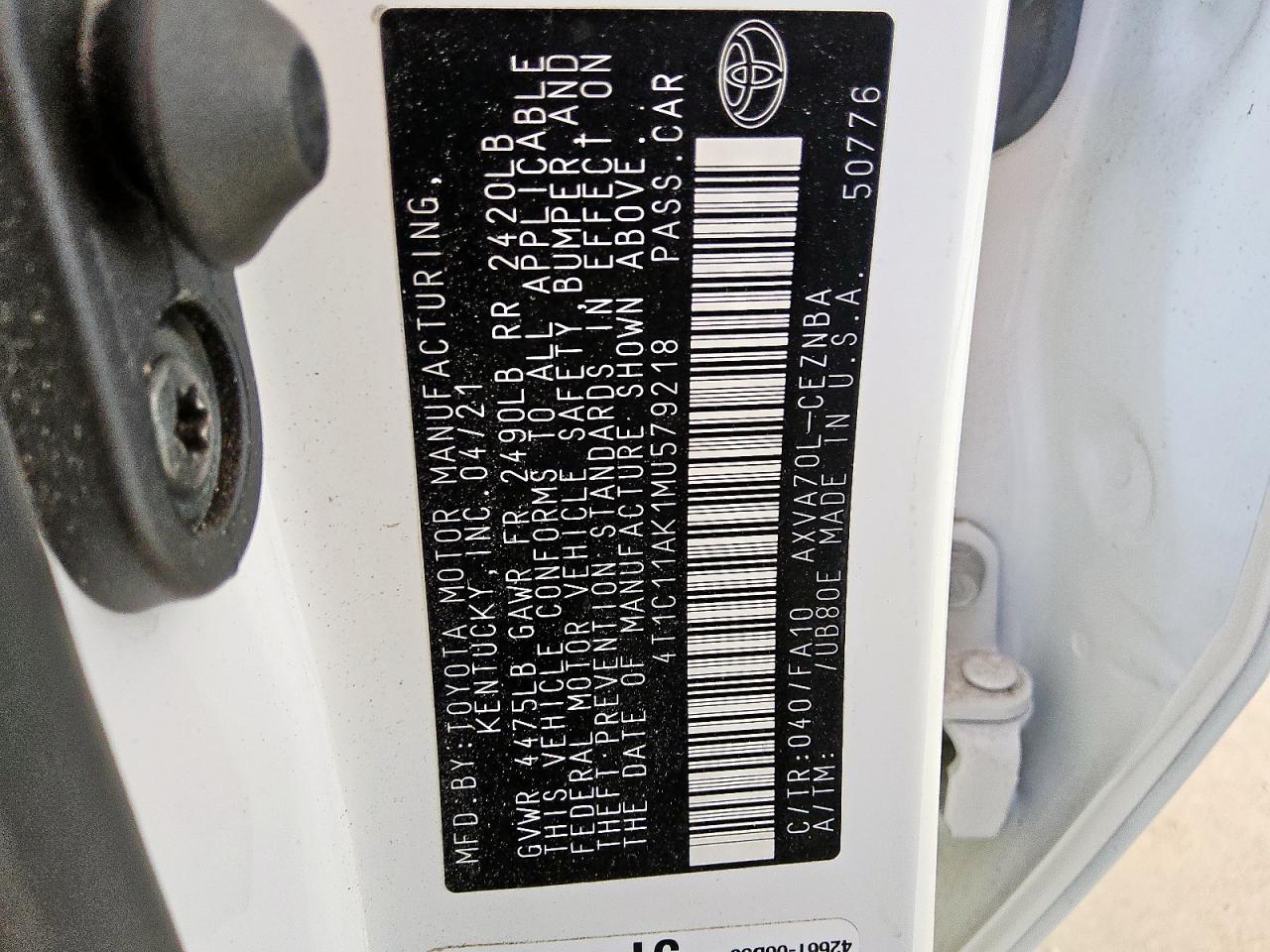 Колір БілийЦиліндри 4VIN 4T1C11AK1MU579218Стан Заводиться та їде (перевірено)Ушкодження НезначніДата аукціона 2025-10-07
