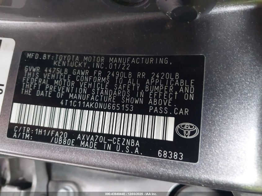2022 TOYOTA CAMRY - 4T1C11AK0NU665153, колір - Сірий, 2.5, Бензин, Передній привід із США