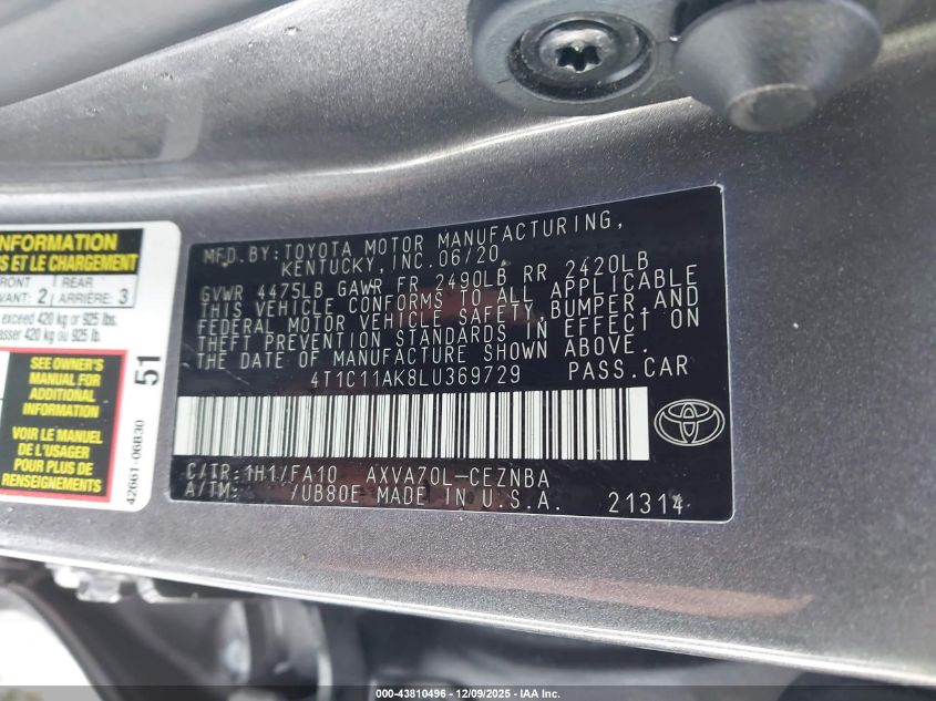 2020 TOYOTA CAMRY - 4T1C11AK8LU369729, колір - Сірий, 2.5, Бензин, Передній привід із США
