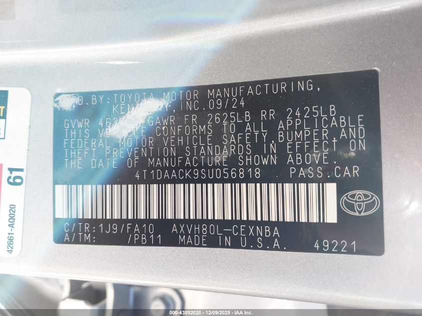 2025 TOYOTA CAMRY - 4T1DAACK9SU056818, колір - Срібний, 2.5, Гібрид, Передній привід із США