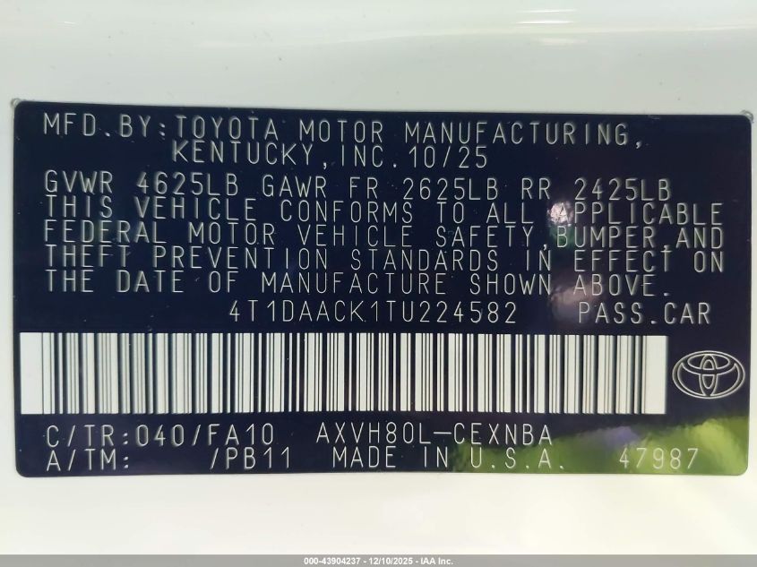 2026 TOYOTA CAMRY - 4T1DAACK1TU224582, колір - Білий, 2.5, Гібрид, Передній привід із США
