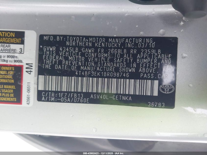 2011 TOYOTA CAMRY - 4T4BF3EK1BR098746, колір - Срібний, 2.5, Бензин, Передній привід із США