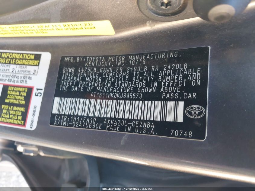 2019 TOYOTA CAMRY - 4T1B11HK0KU695573, колір - Сірий, 2.5, Бензин, Передній привід із США
