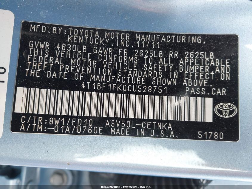 2012 TOYOTA CAMRY - 4T1BF1FK0CU528751, колір - Синій, 2.5, Бензин, Передній привід із США