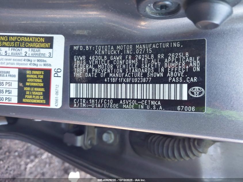 2015 TOYOTA CAMRY - 4T1BF1FK8FU923877, колір - Сірий, 2.5, Бензин, Передній привід із США