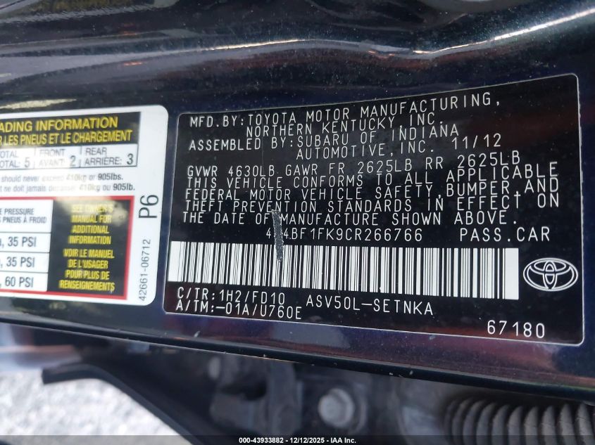 2012 TOYOTA CAMRY - 4T4BF1FK9CR266766, колір - Чорний, 2.5, Бензин, Передній привід із США