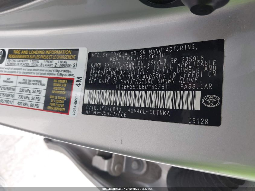 2011 TOYOTA CAMRY - 4T1BF3EK8BU163781, колір - Срібний, 2.5, Бензин, Передній привід із США