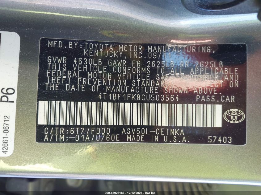 Колір СірийЦиліндри 4Привід Передній привідVIN 4T1BF1FK8CU503564Стан Заводиться та їде (перевірено)Ушкодження Задня