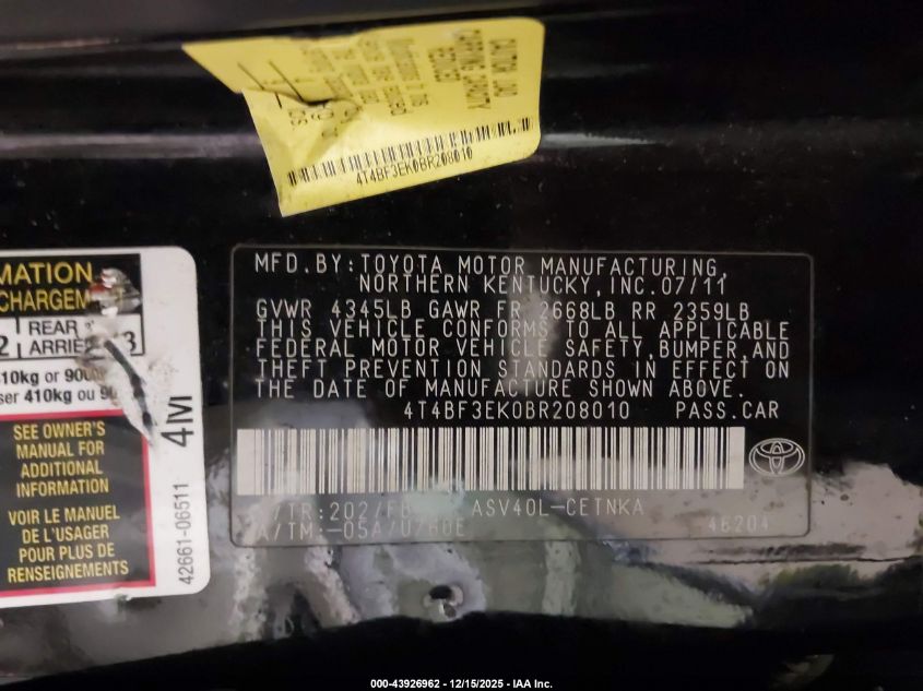 2011 TOYOTA CAMRY BASE