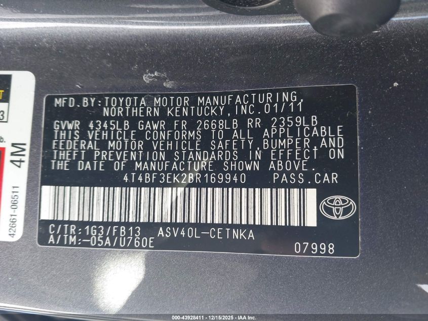 2011 TOYOTA CAMRY - 4T4BF3EK2BR169940, колір - , 2.5, Бензин, Передній привід із США