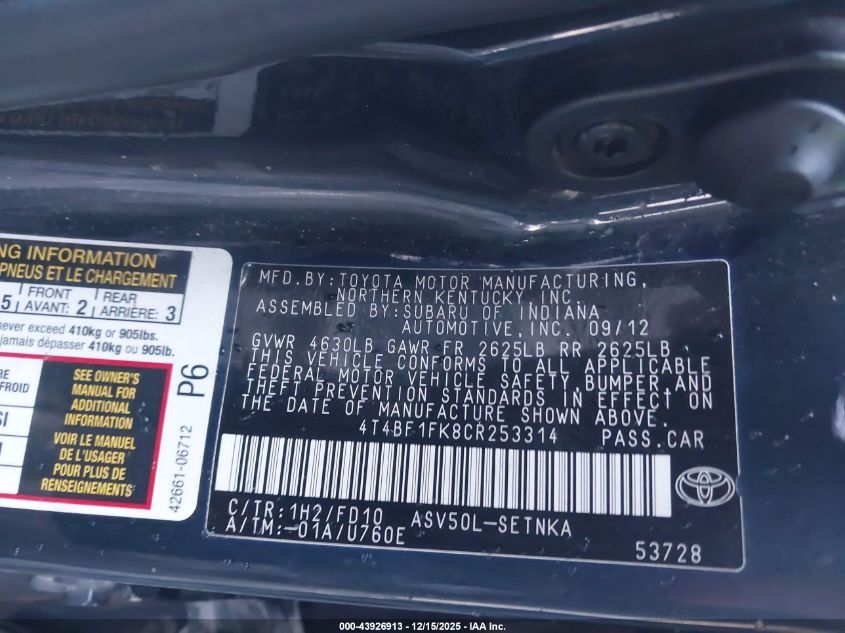 Колір СинійЦиліндри 4Привід Передній привідVIN 4T4BF1FK8CR253314Стан СтаціонарноУшкодження Передня або задня