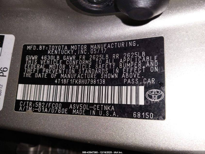 2017 TOYOTA CAMRY - 4T1BF1FK8HU798138, колір - Шампань, 2.5, Бензин, Передній привід із США