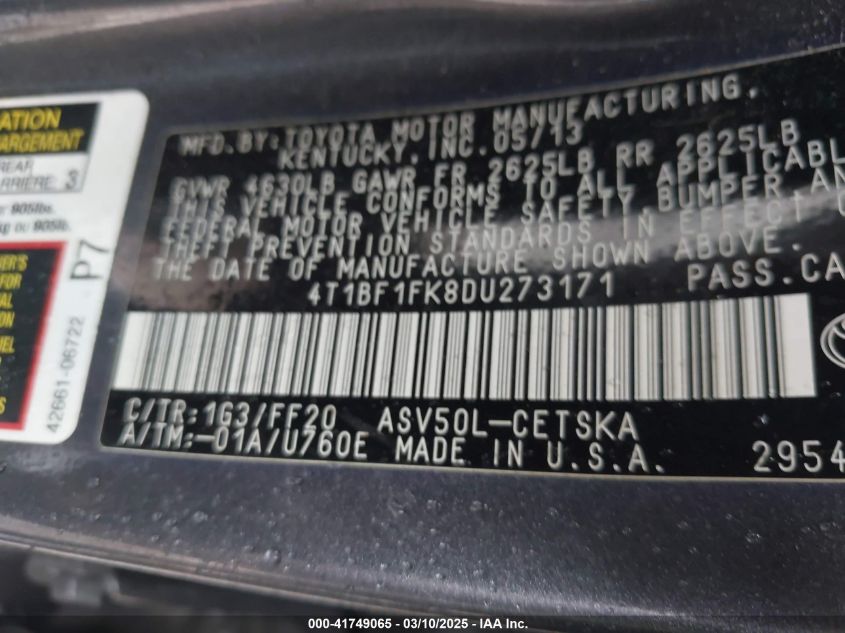 2013 TOYOTA CAMRY - 4T1BF1FK8DU273171, колір - Сірий, 2.5, Бензин, Передній привід із США