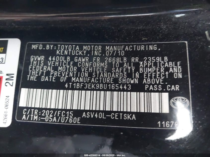 2011 TOYOTA CAMRY - 4T1BF3EK9BU165443, колір - Чорний, 2.5, Бензин, Передній привід із США