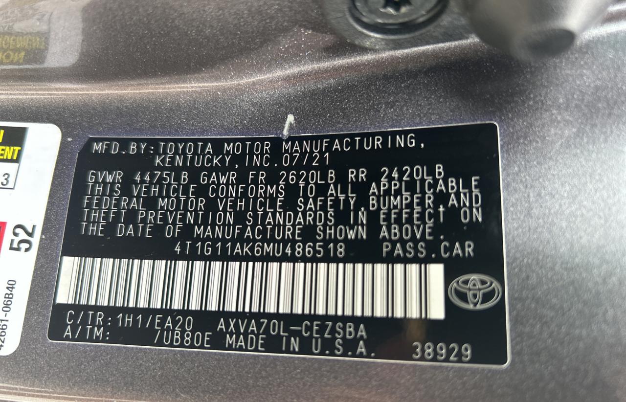 2021 TOYOTA CAMRY - 4T1G11AK6MU486518, колір - Сірий, 2.5, Бензин, із США