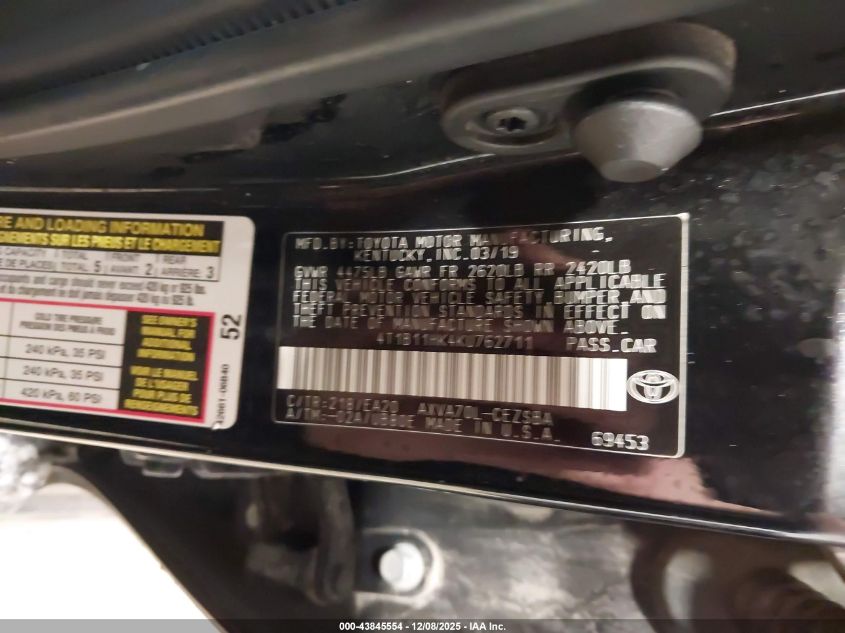 2019 TOYOTA CAMRY - 4T1B11HK4KU762711, колір - Чорний, 2.5, Бензин, Передній привід із США