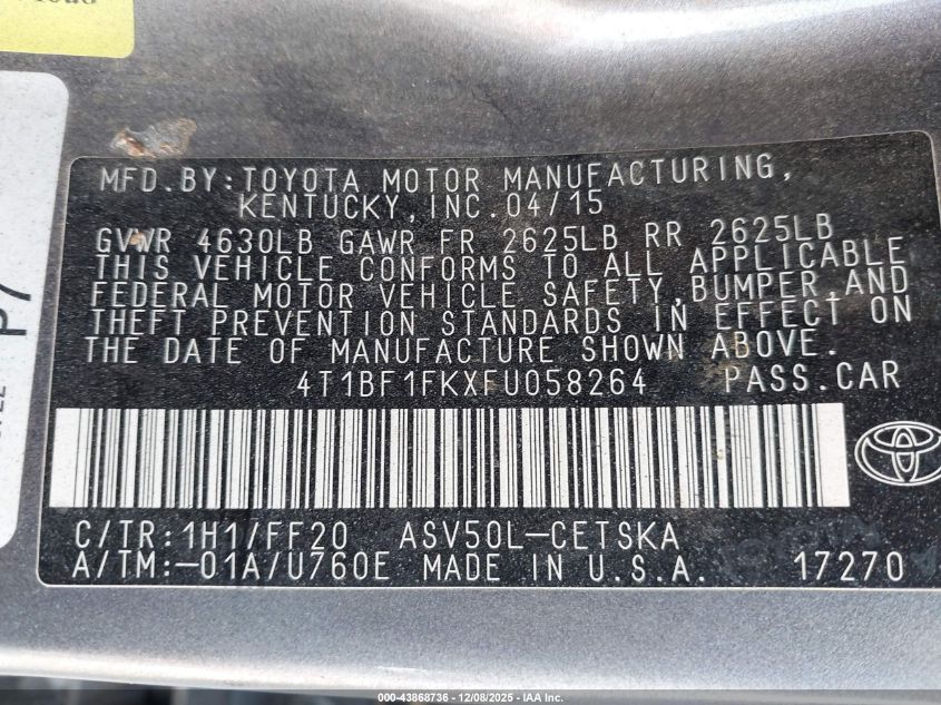 2015 TOYOTA CAMRY - 4T1BF1FKXFU058264, колір - Чорний, 2.5, Бензин, Передній привід із США