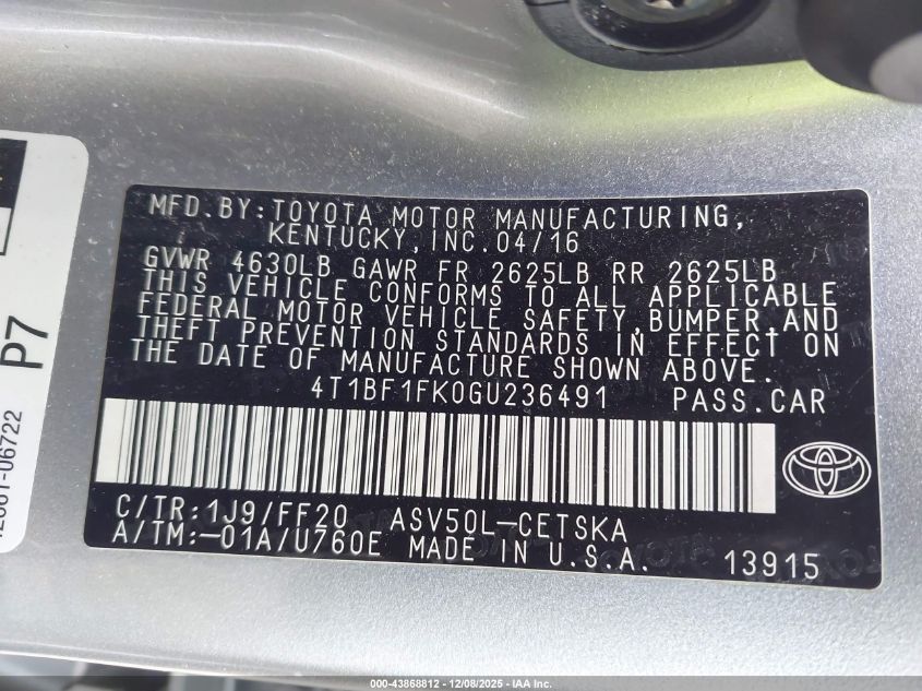 2016 TOYOTA CAMRY - 4T1BF1FK0GU236491, колір - Срібний, 2.5, Бензин, Передній привід із США