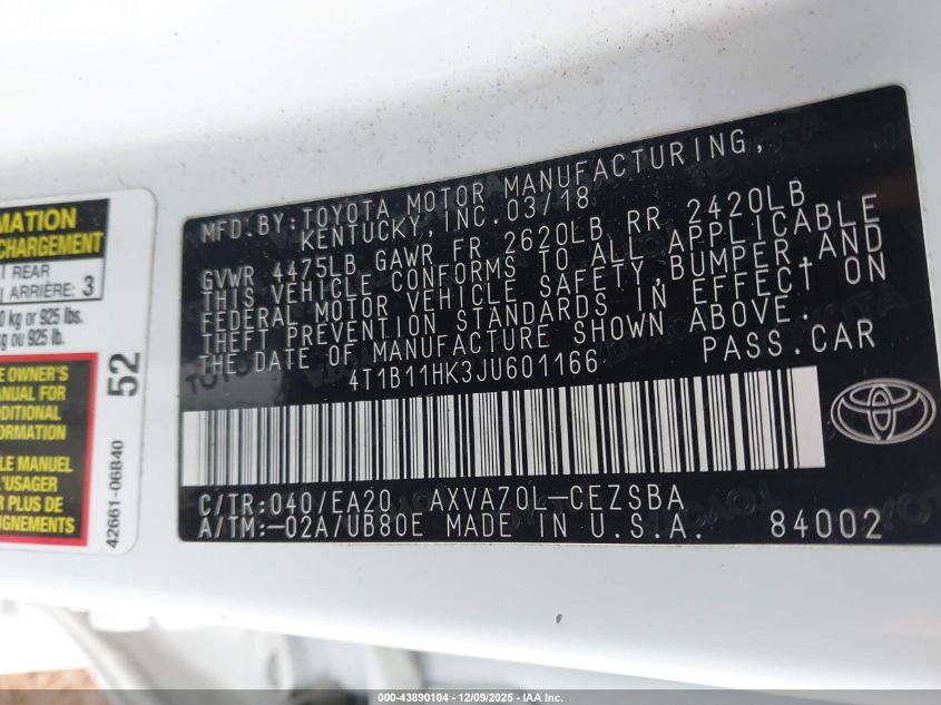 2018 TOYOTA CAMRY - 4T1B11HK3JU601166, колір - Білий, 2.5, Бензин, Передній привід із США