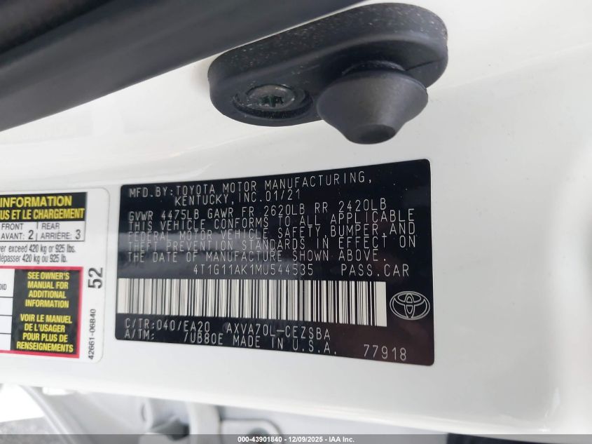 2021 TOYOTA CAMRY - 4T1G11AK1MU544535, колір - Білий, 2.5, Бензин, Передній привід із США