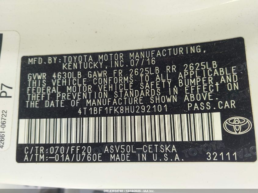 2017 TOYOTA CAMRY - 4T1BF1FK8HU292101, колір - Білий, 2.5, Бензин, Передній привід із США