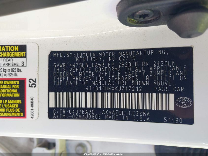 2019 TOYOTA CAMRY - 4T1B11HKXKU747212, колір - Білий, 2.5, Бензин, Передній привід із США