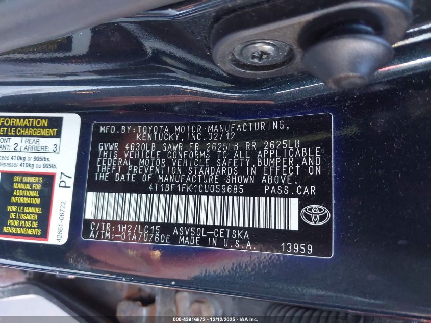 2012 TOYOTA CAMRY - 4T1BF1FK1CU059685, колір - Чорний, 2.5, Бензин, Передній привід із США