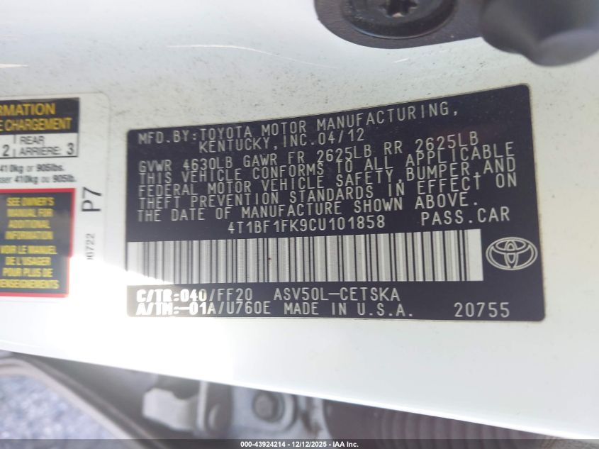 2012 TOYOTA CAMRY - 4T1BF1FK9CU101858, колір - Білий, 2.5, Бензин, Передній привід із США