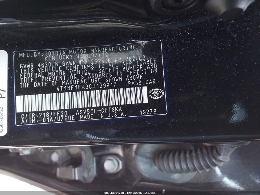 2012 TOYOTA CAMRY - 4T1BF1FK9CU139817, колір - Чорний, 2.5, Бензин, Передній привід із США