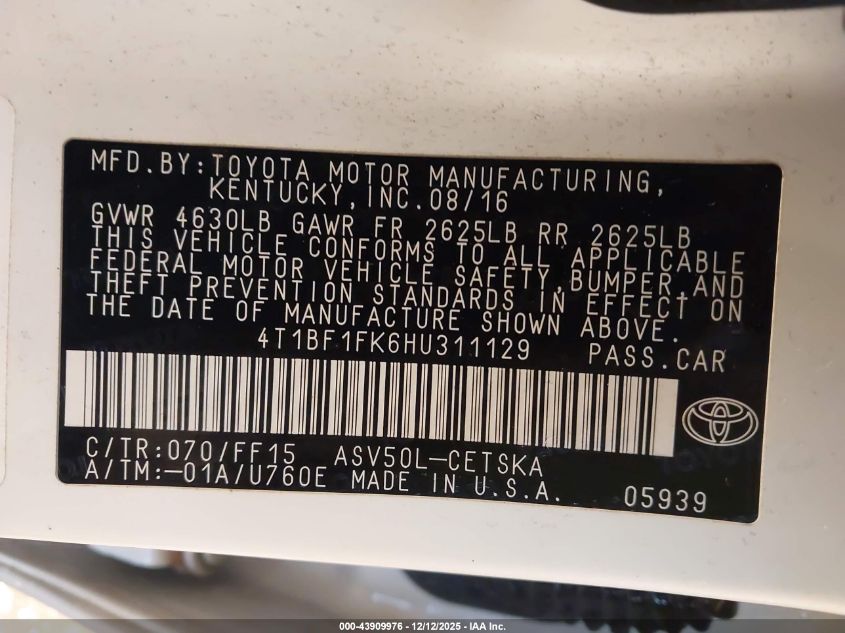 2017 TOYOTA CAMRY - 4T1BF1FK6HU311129, колір - Білий, 2.5, Бензин, Передній привід із США