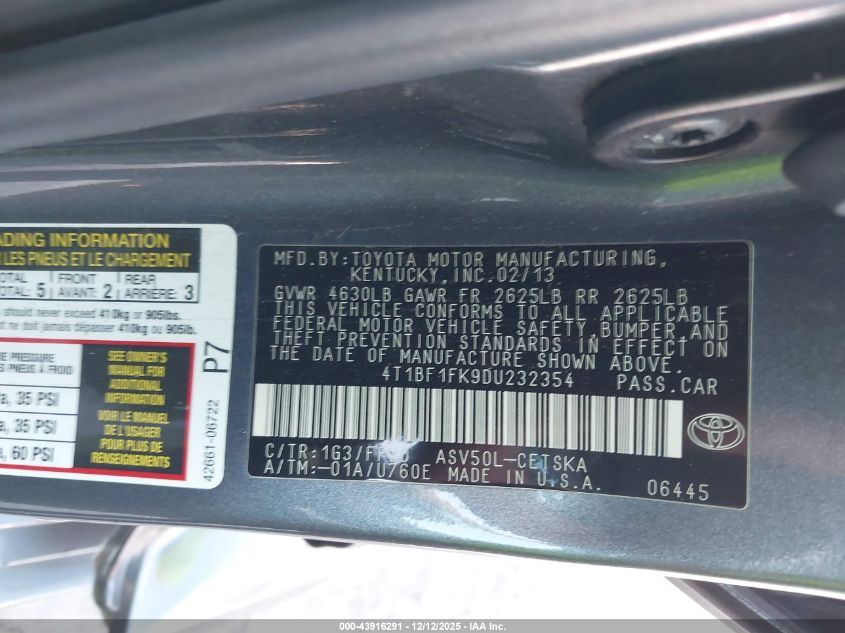 2013 TOYOTA CAMRY - 4T1BF1FK9DU232354, колір - Сірий, 2.5, Бензин, Передній привід із США