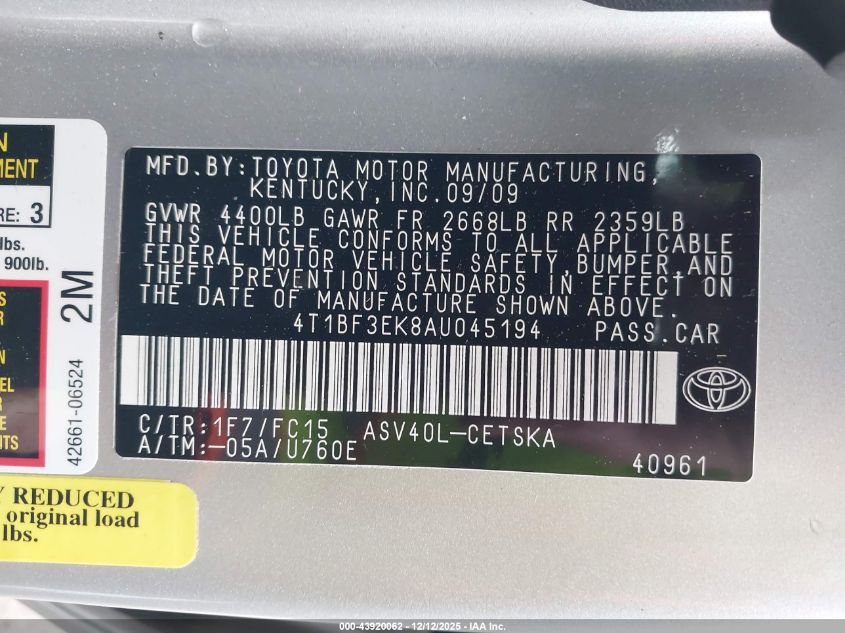 2010 TOYOTA CAMRY - 4T1BF3EK8AU045194, колір - Срібний, 2.5, Бензин, Передній привід із США