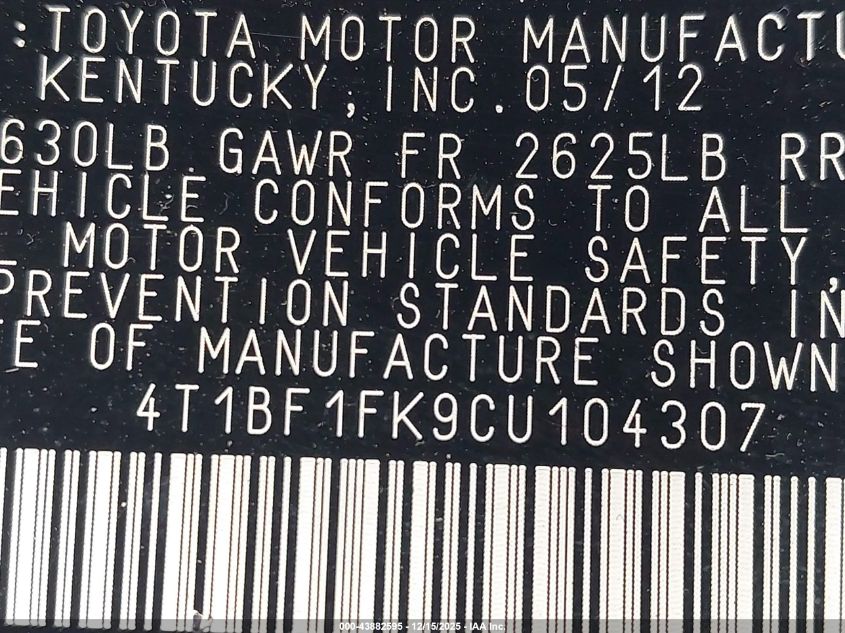 2012 TOYOTA CAMRY - 4T1BF1FK9CU104307, колір - Чорний, 2.5, Бензин, Передній привід із США
