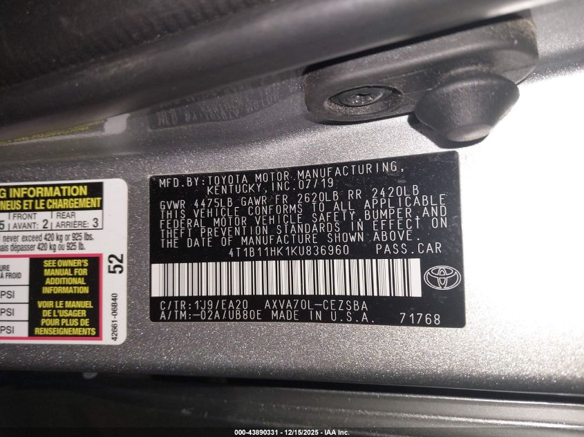 2019 TOYOTA CAMRY - 4T1B11HK1KU836960, колір - Срібний, 2.5, Бензин, Передній привід із США