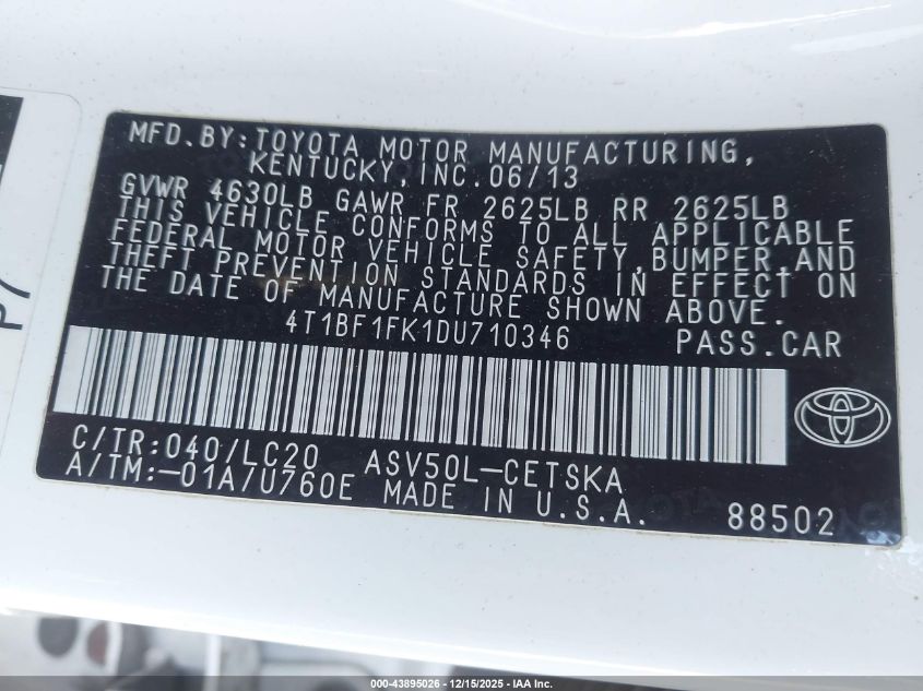2013 TOYOTA CAMRY - 4T1BF1FK1DU710346, колір - Білий, 2.5, Бензин, Передній привід із США