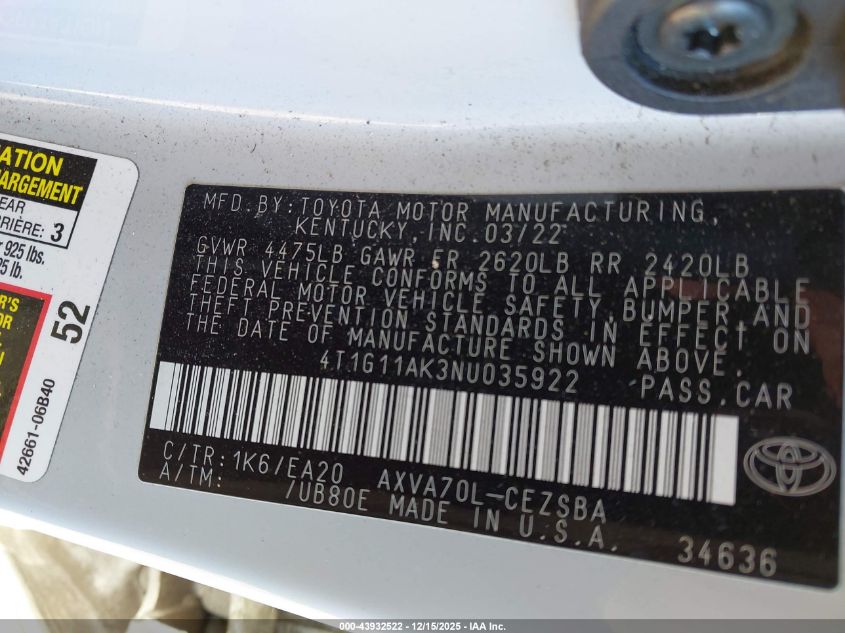 2022 TOYOTA CAMRY - 4T1G11AK3NU035922, колір - Сірий, 2.5, Бензин, Передній привід із США