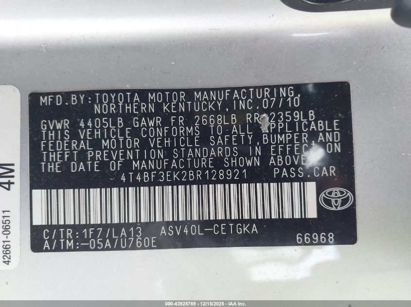 Колір СрібнийЦиліндри 4Привід Передній привідVIN 4T4BF3EK2BR128921Стан НевідомоУшкодження Права сторона