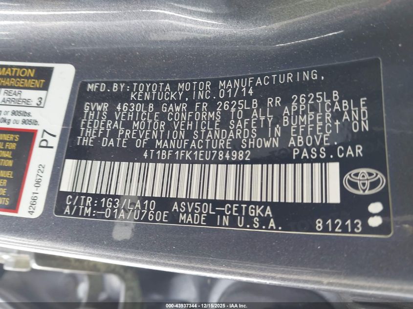 2014 TOYOTA CAMRY - 4T1BF1FK1EU784982, колір - Сірий, 2.5, Бензин, Передній привід із США