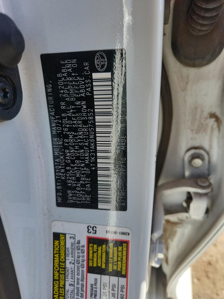 2022 TOYOTA CAMRY - 4T1K31AK6NU575852, колір - Білий, 2.5, Гібрид, із США