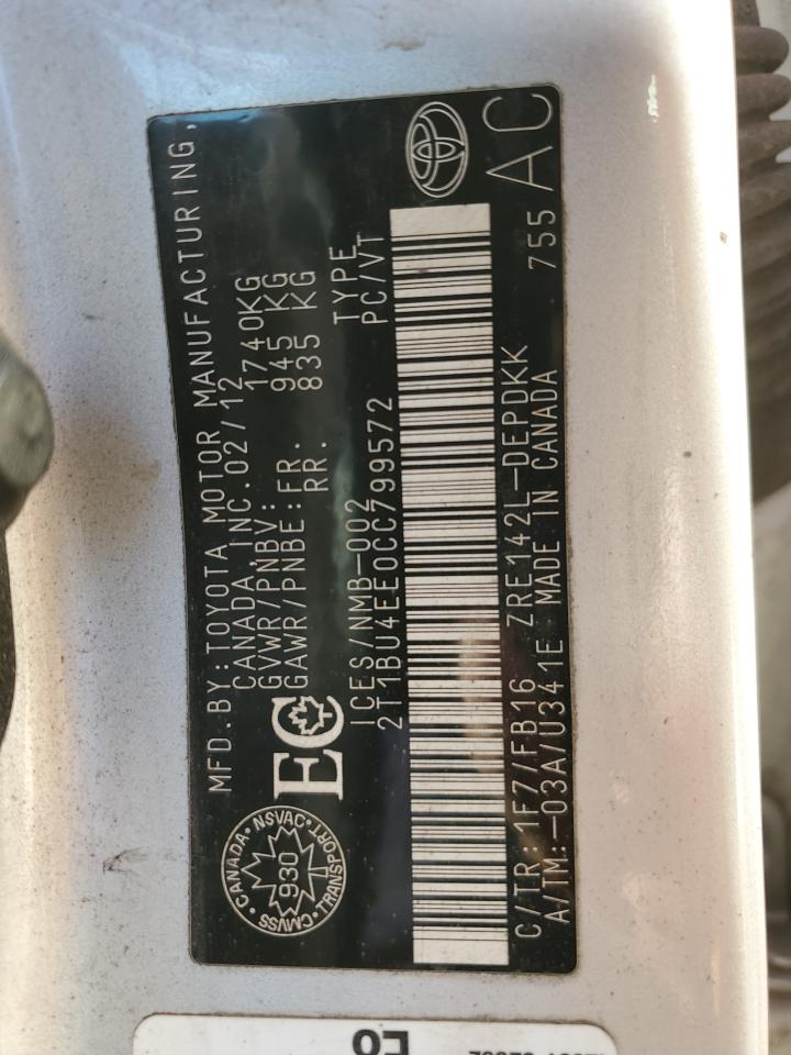 2012 TOYOTA COROLLA - 2T1BU4EE0CC799572, колір - Срібний, 1.8, Бензин, із США