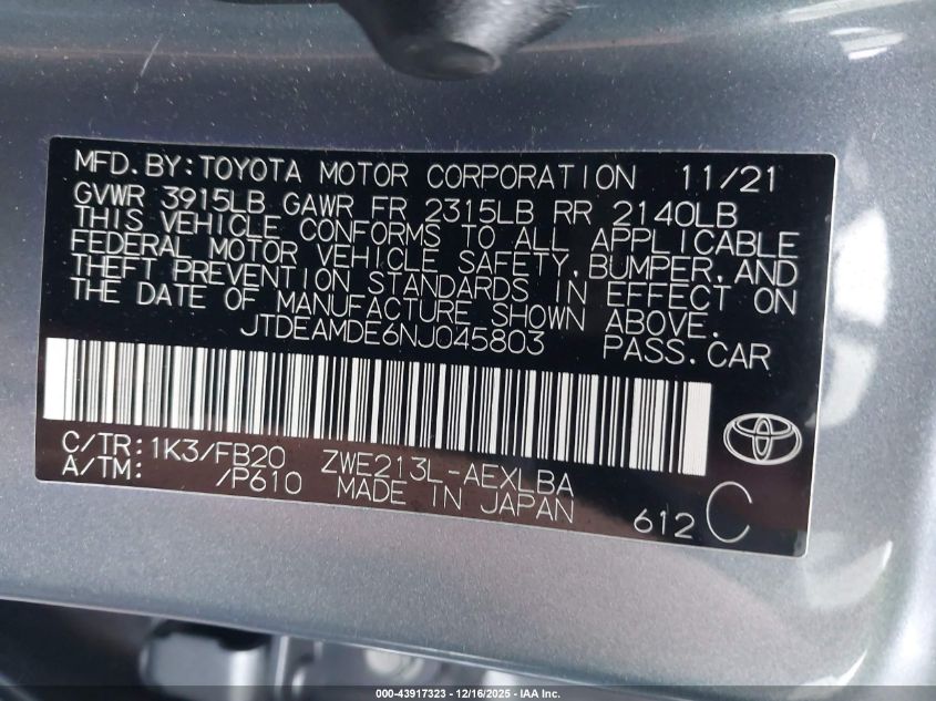 2022 TOYOTA COROLLA - JTDEAMDE6NJ045803, колір - , 1.8, Гібрид, Передній привід із США