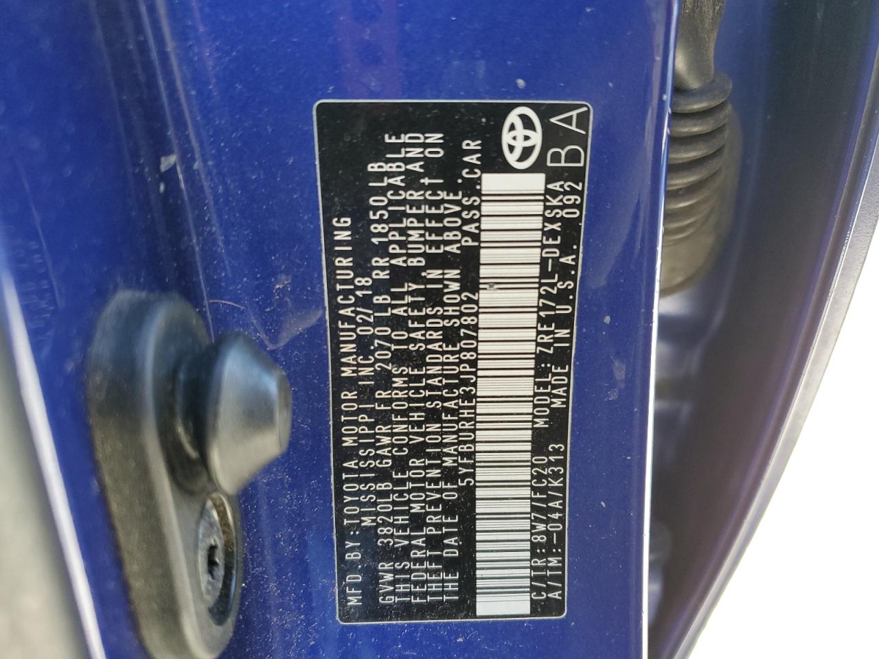 Колір СинійЦиліндри 4VIN 5YFBURHE3JP807802Стан НевідомоУшкодження Передня або задня