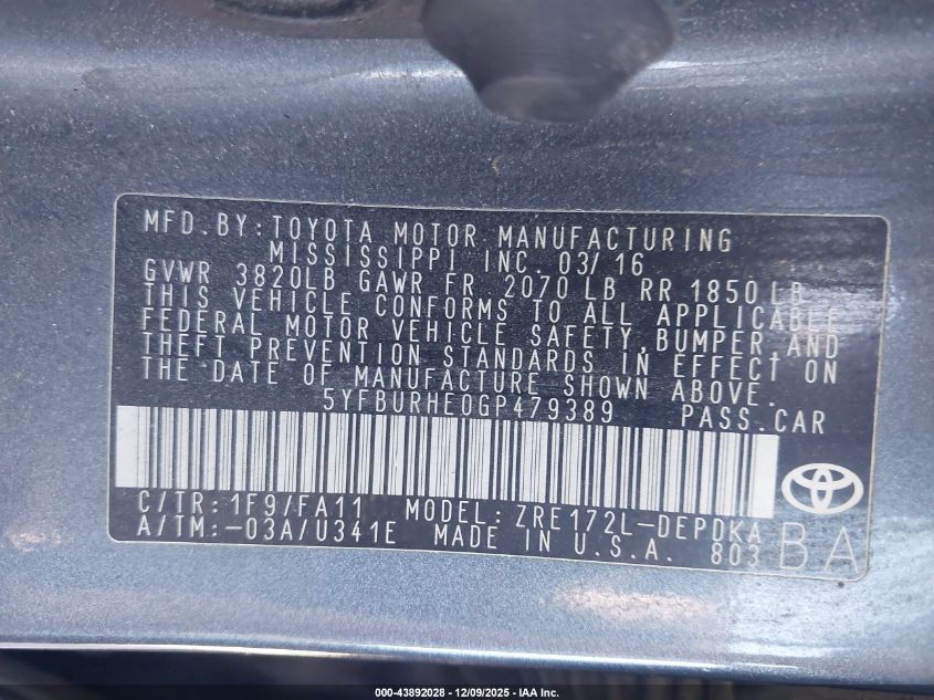 2016 TOYOTA COROLLA - 5YFBURHE0GP479389, колір - Сірий, 1.8, Бензин, Передній привід із США