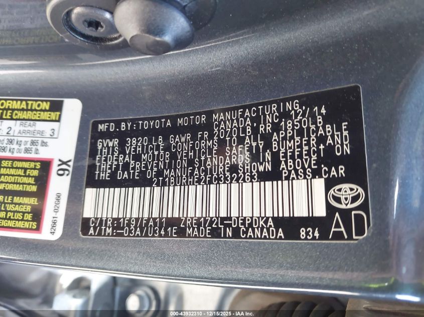 2015 TOYOTA COROLLA - 2T1BURHE2FC332263, колір - Сірий, 1.8, Бензин, Передній привід із США