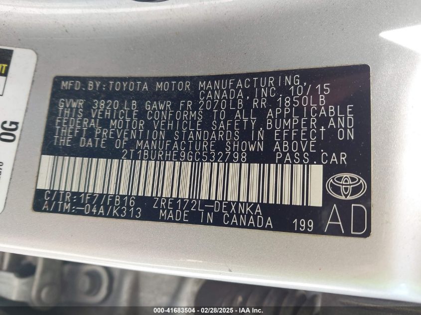 2016 TOYOTA COROLLA - 2T1BURHE9GC532798, колір - Срібний, 1.8, Бензин, Передній привід із США