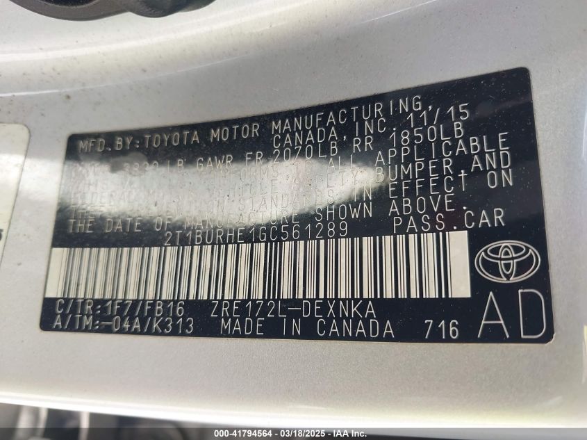 2016 TOYOTA COROLLA - 2T1BURHE1GC******, колір - Срібний, 1.8, Бензин, Передній привід із США